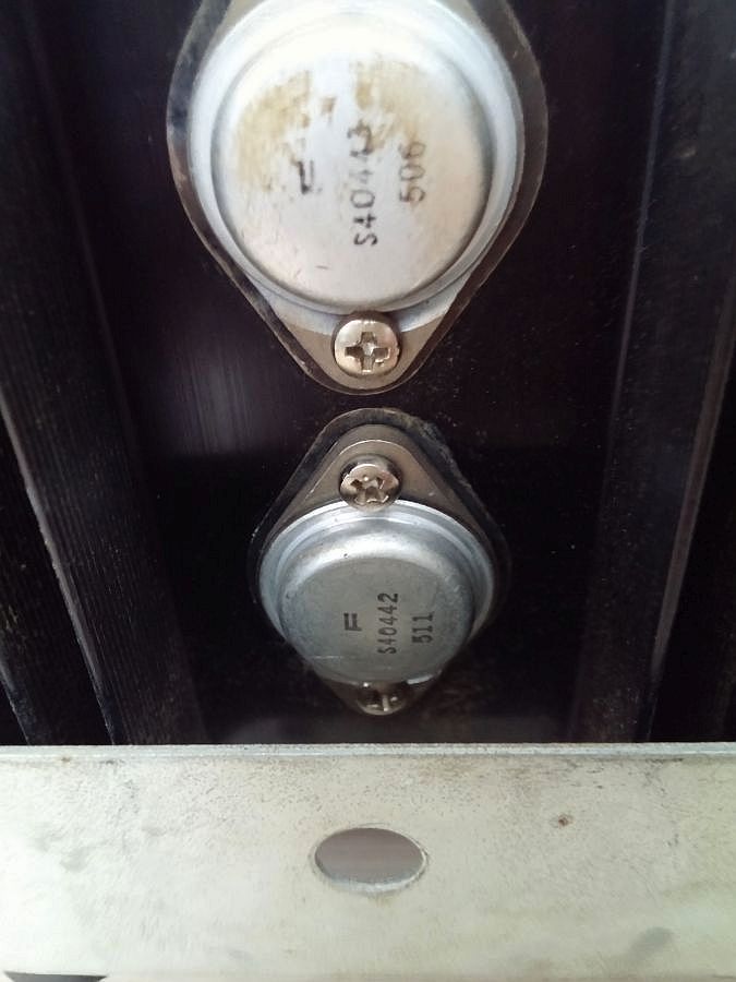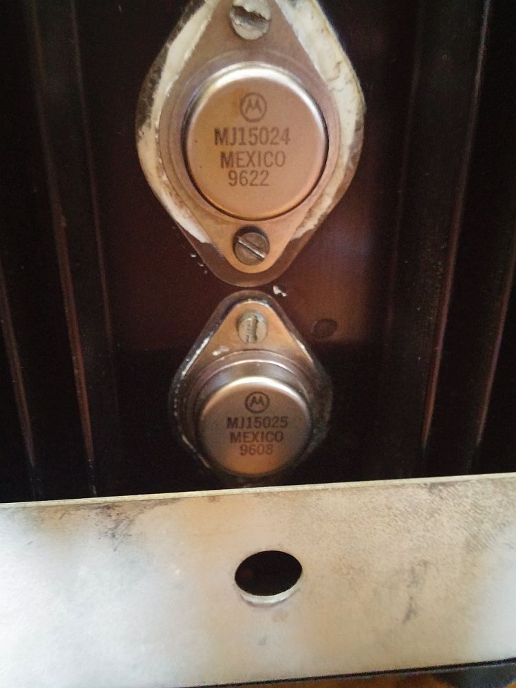 marantz 1150d - original output transistors Fairchild S40443/S40442 (left) and replacement Motorola (MJ15024/15025) (right)